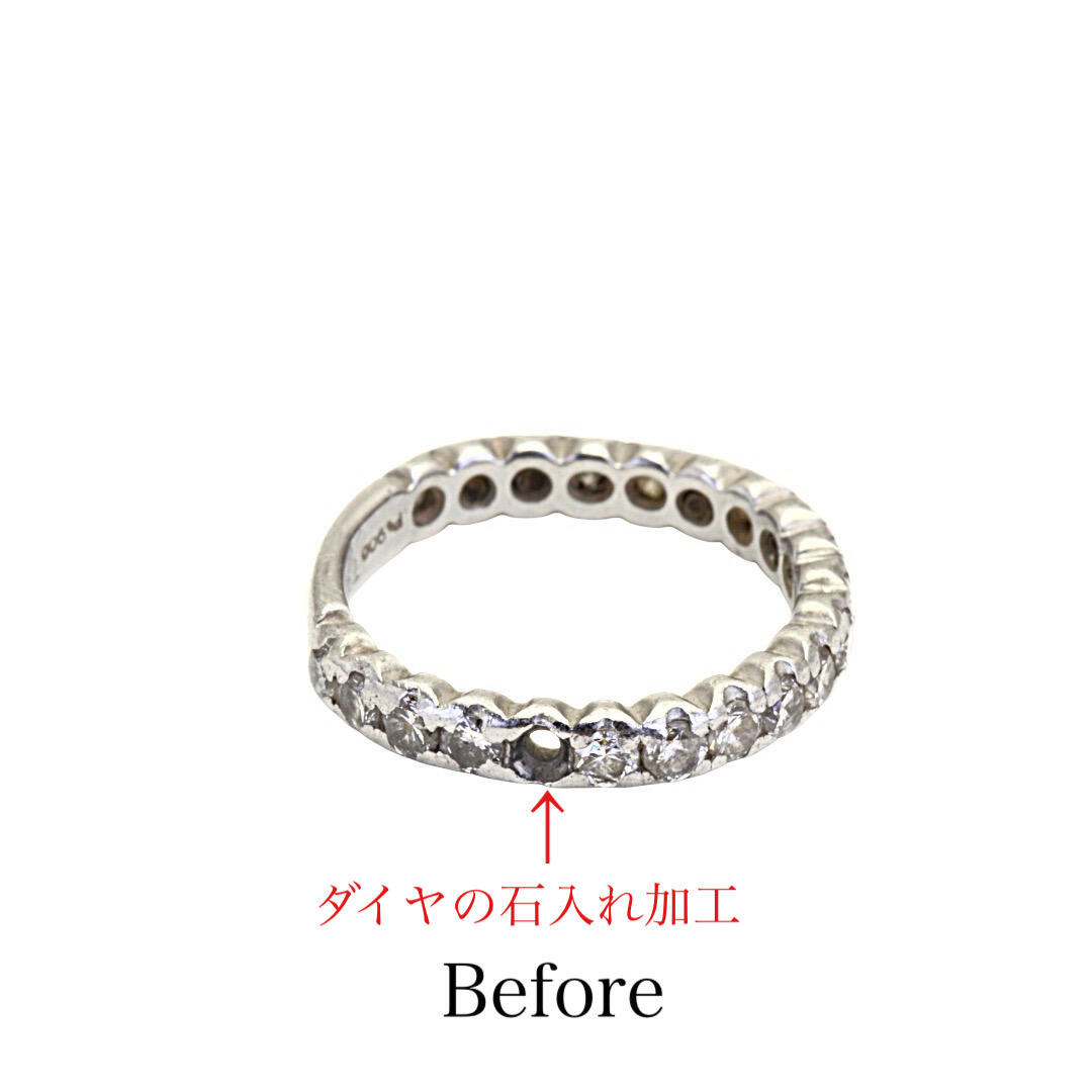 プラチナ製のハーフエタニティダイヤモンドリングの変形直しとダイヤ1石を埋め込み修理加工